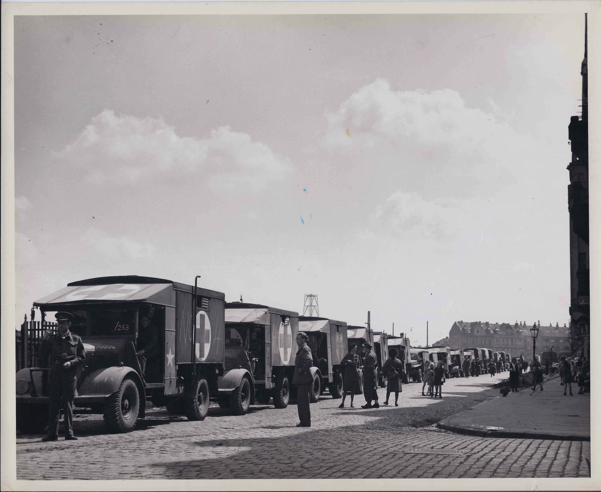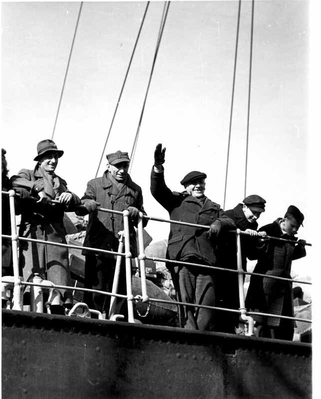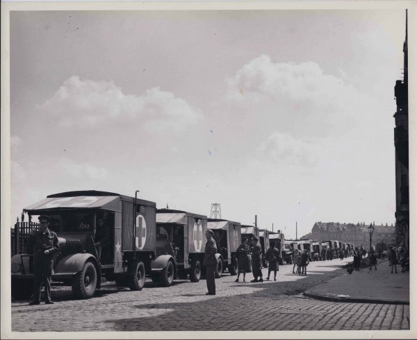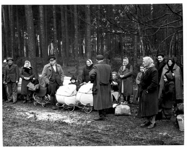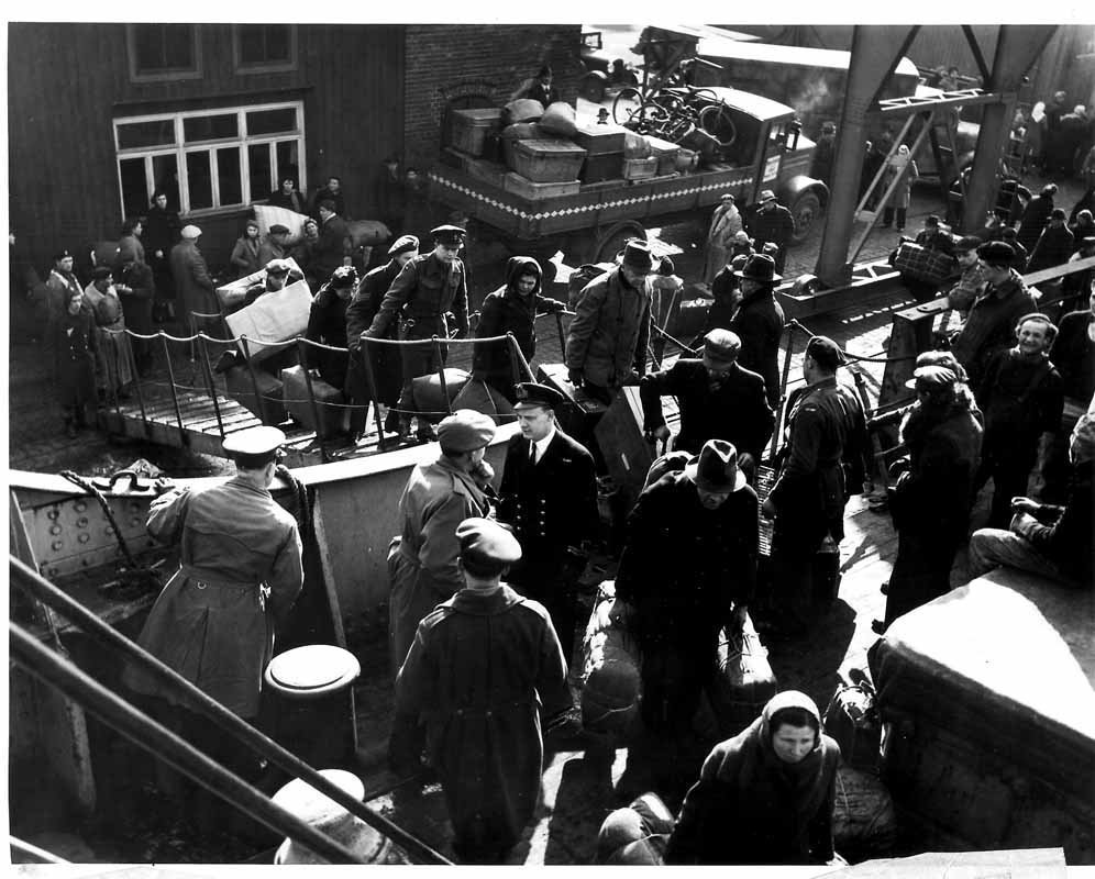 The next set of photographs shows a few images of the repatriation of 1,400 Polish displaced persons.  The first shows the embarkation at Lubeck docks, on their way to Danzig, and my father has written on the back of one of these photos "most carried all they owned".  These photos are followed by some showing the deported families travelling by road and rail, then awaiting their transit camp beside the railway track where they were offloaded, setting up temporary home for the next three days at Danzig,  The last photo in this series shows a young girl being examined in a hospital in Danzig.