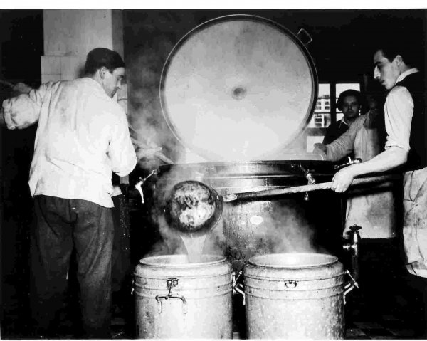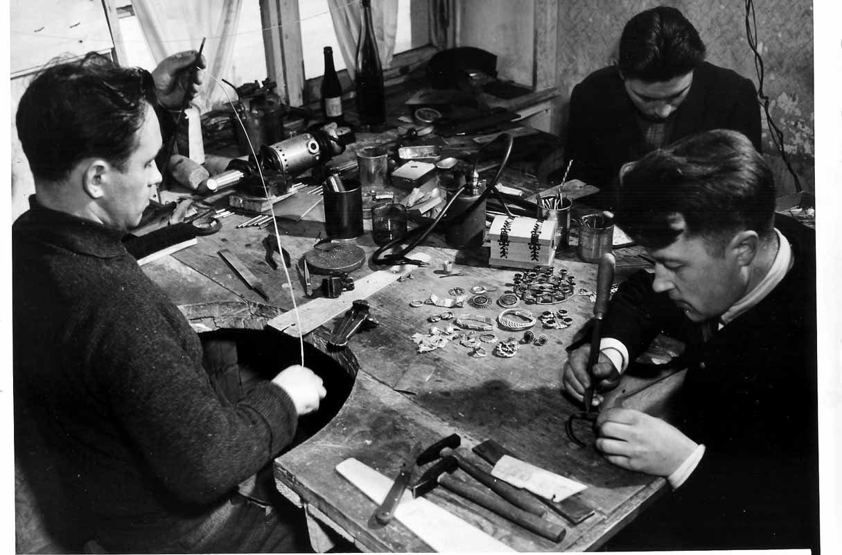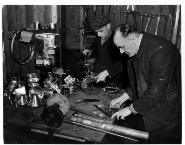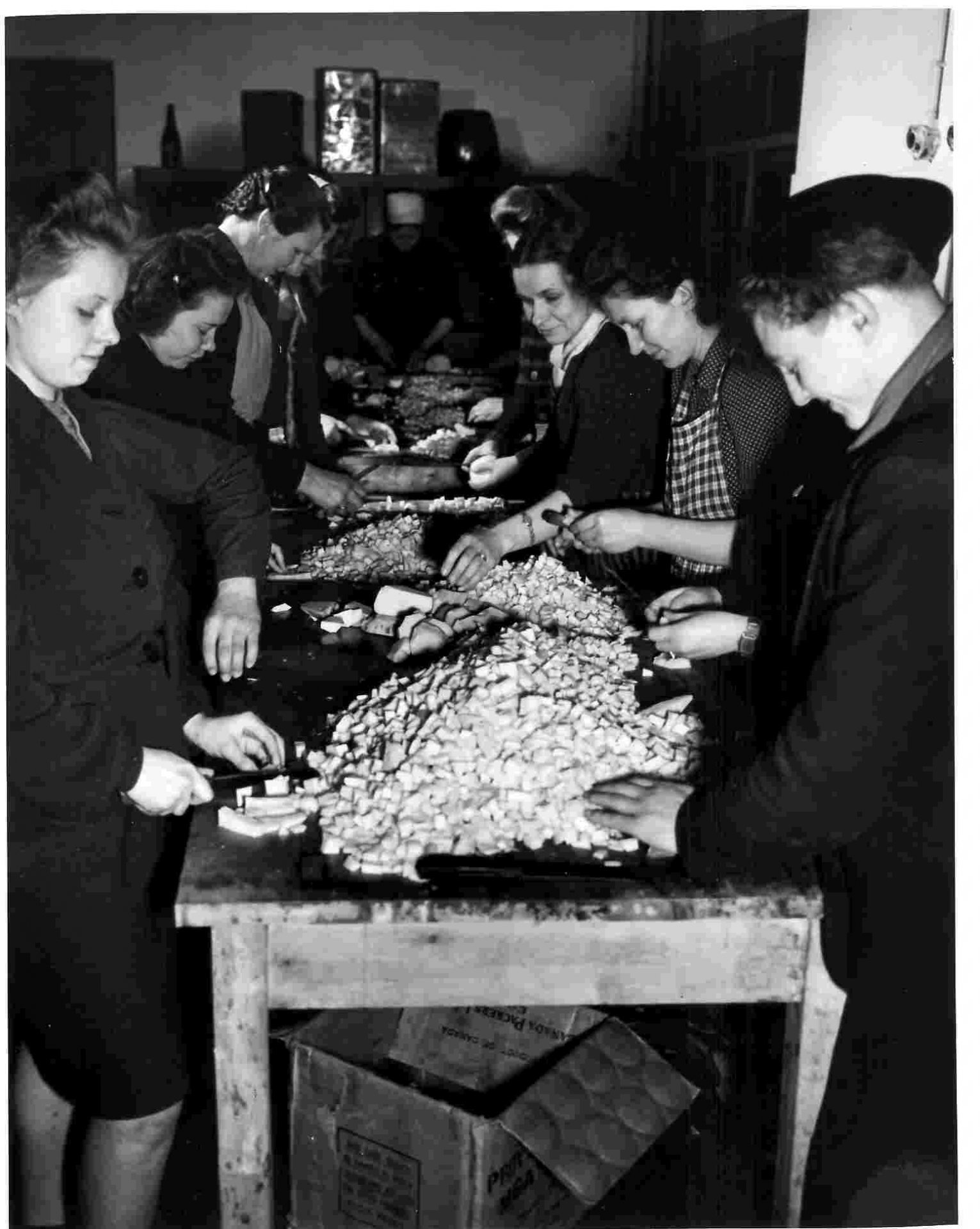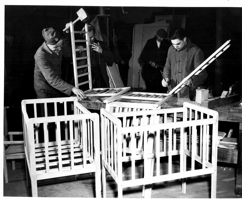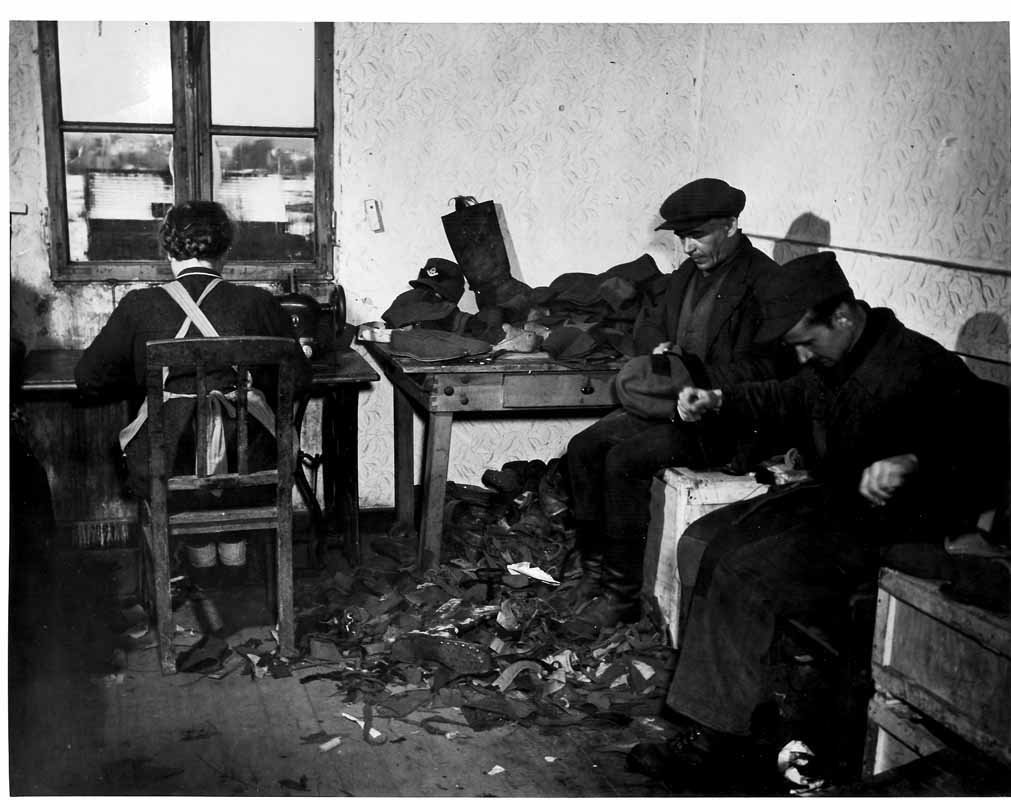 This first group of photos shows various workshops.  Scrap tin cans are being recycled into jewellry, teapots, etc., scrap wood is being used to make cots and toys (although, rather poignantly, leaning on the wall behind the man on the right painting the Noah's Ark figures, pieces of wood have been shaped ready to be made into rifles), and parts of shoes are being salvaged.