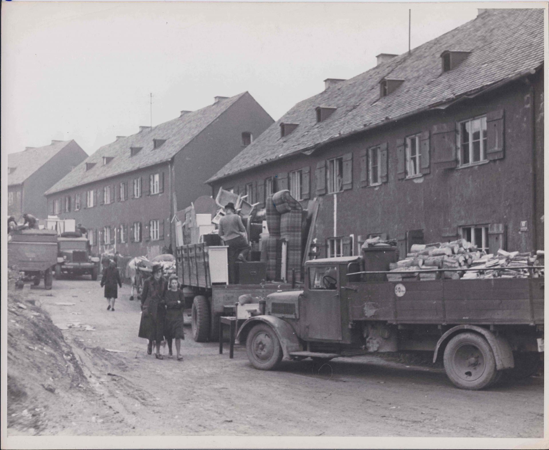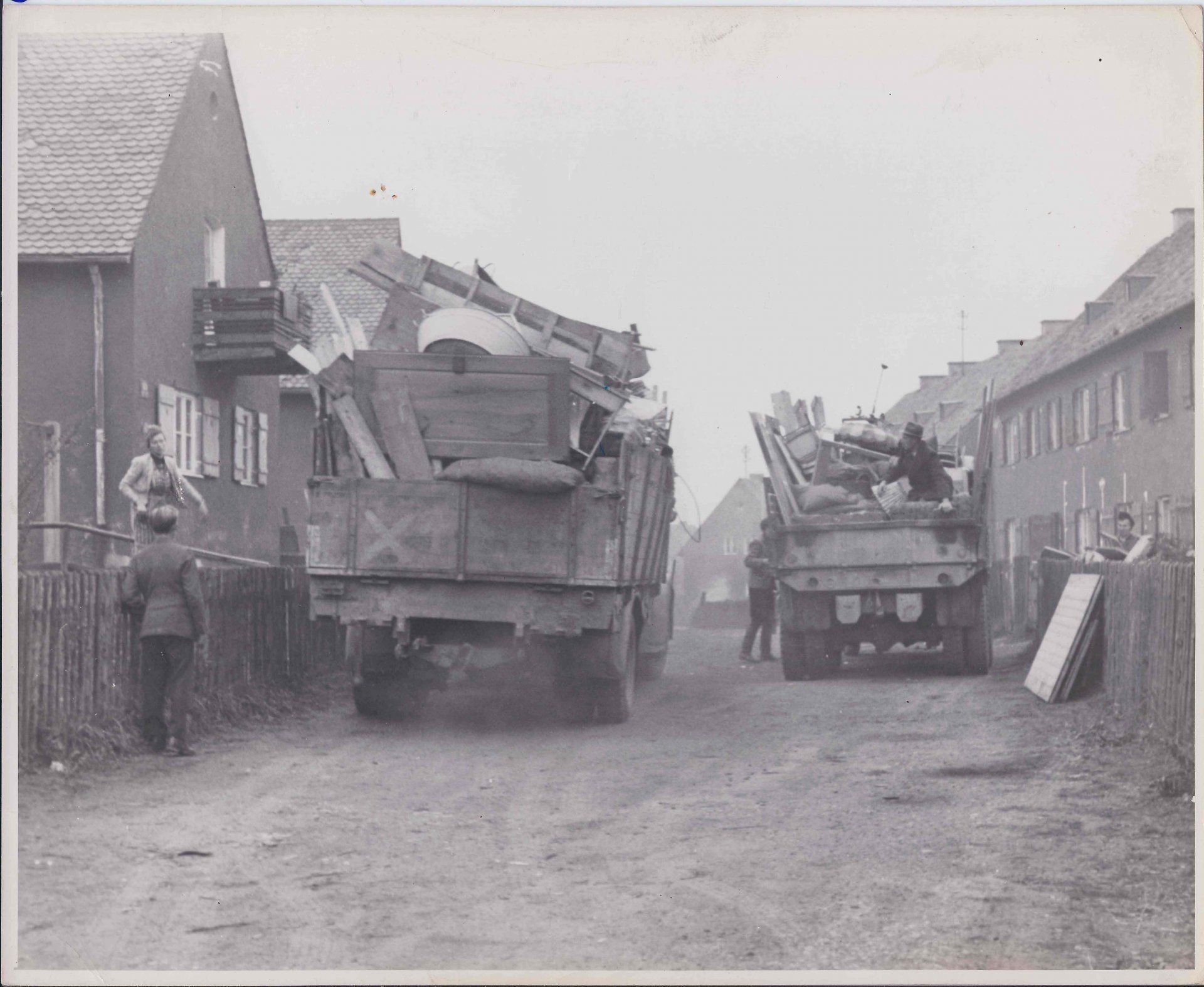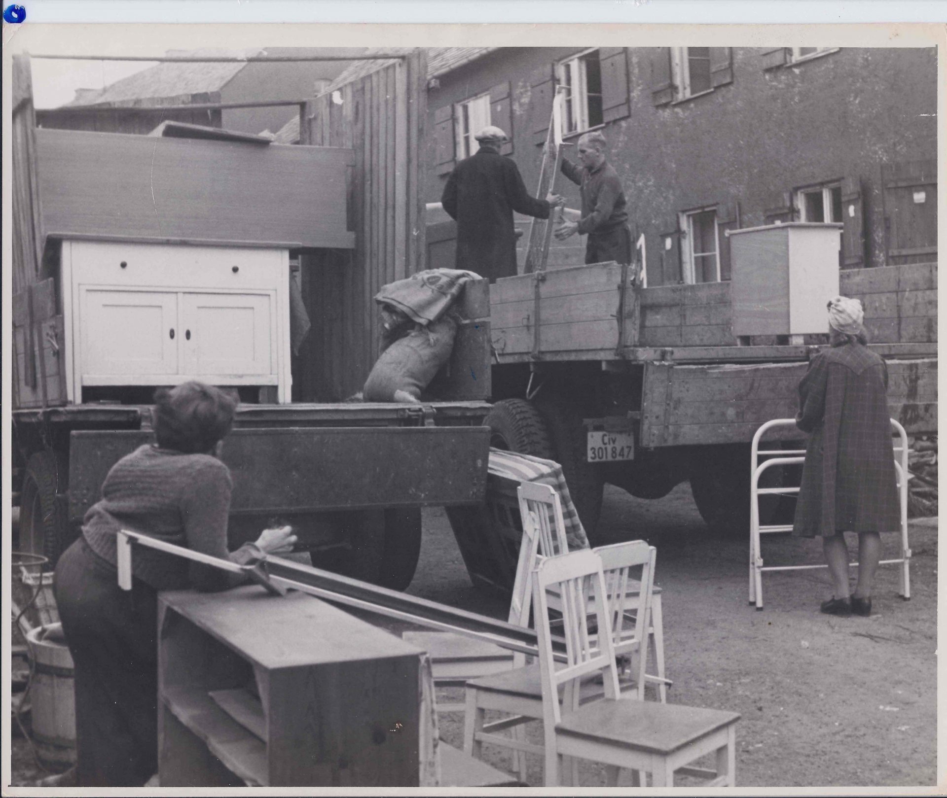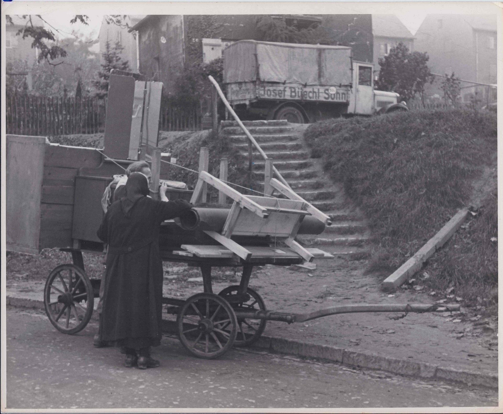 The following five photos are from an envelope simply marked "Eviction of German civilians from their homes".  The Imperial War Museum has dated these as having been taken in 1946, when German families were being moved to new German billets.  One shows a small boy watching as the contents of his home is loaded onto a lorry, and another depicts an elderly couple loading what they can onto a handcart.
